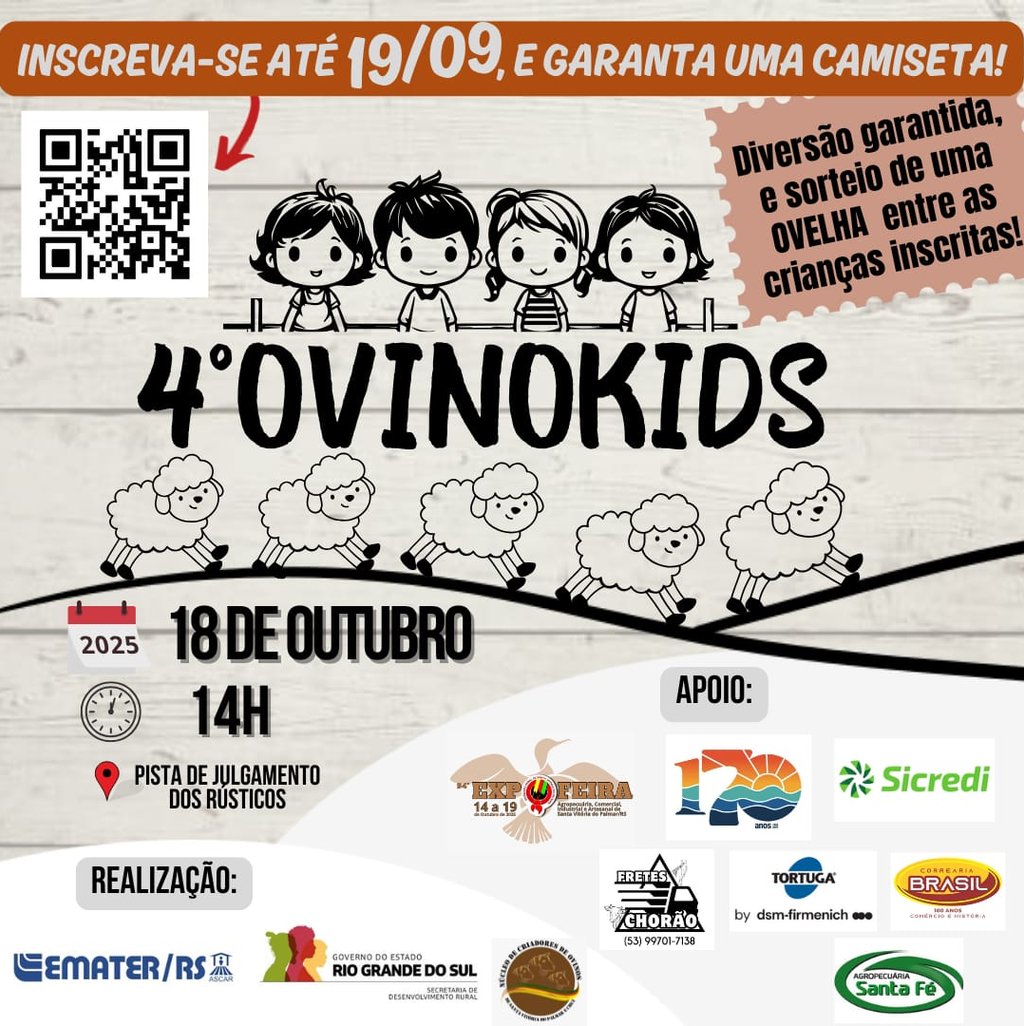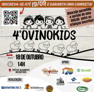 Vem aí o 4º OVINOKIDS! Dia 18 de outubro, às 14h, na nossa Expofeira. Crianças inscritas até 19/09 ganham camiseta do evento. E tem mais: sorteio de uma ovelha entre os participantes inscritos!