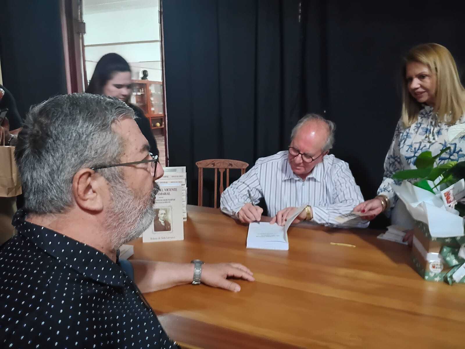 O escritor Rubens Carrasco concedeu autógrafo ao diretor do jornal Liberal, jornalista Faustino Borges Munhoz, durante o evento.