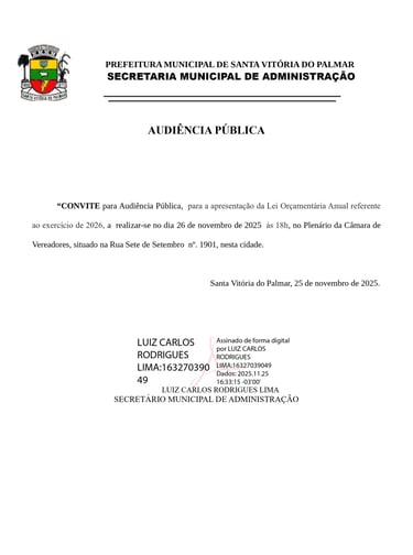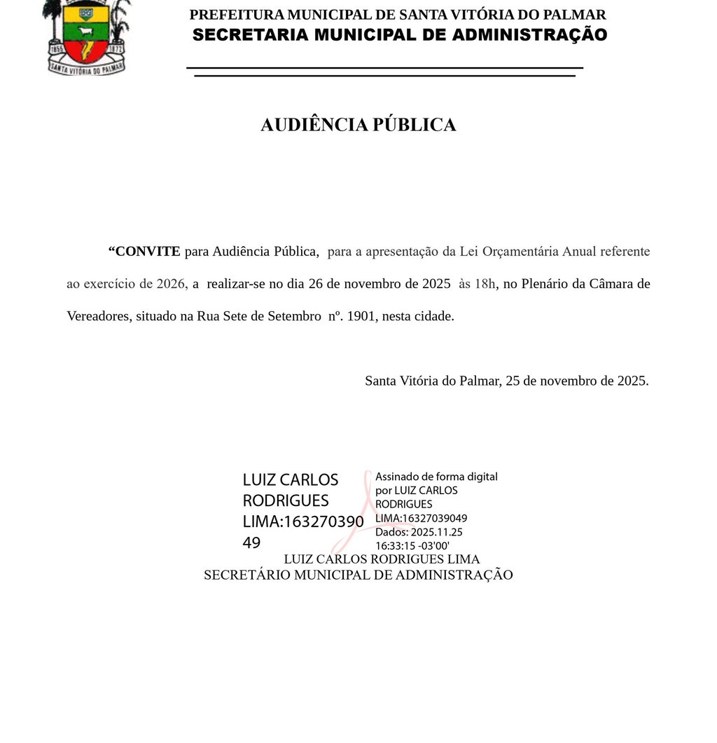 “CONVITE para Audiência Pública, para a apresentação da Lei Orçamentária Anual referente - ao exercício de 2026, a realizar-se no dia 26 de novembro de 2025 às 18h, no Plenário da Câmara de Vereadores, situado na Rua Sete de Setembro no. 1901, nesta cidade.