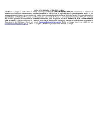 EDITAL DE CHAMAMENTO PÚBLICO N.o 01/2026 A Prefeitura Municipal de Santa Vitória do Palmar informa que está aberto o CHAMAMENTO PÚBLICO para seleção de empresas do setor da construção civil, interessadas em manifestar interesse na execução de 30 unidades habitacionais de interesse social. As mo- radias serão construídas em terreno de domínio público pertencente ao Município de Santa Vitória do Palmar – RS