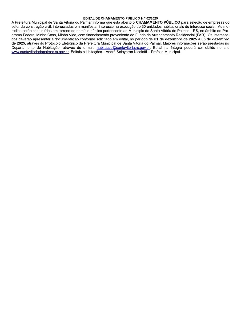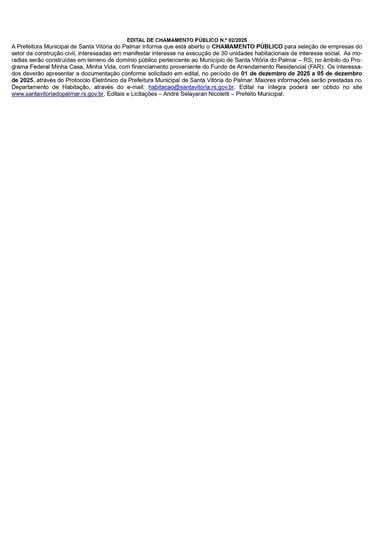 A Prefeitura Municipal de Santa Vitória do Palmar informa que está aberto o CHAMAMENTO PÚBLICO para seleção de empresas do setor da construção civil, interessadas em manifestar interesse na execução de 30 unidades habitacionais de interesse social. As moradias serão construídas em terreno de domínio público pertencente ao Município de Santa Vitória do Palmar – RS,