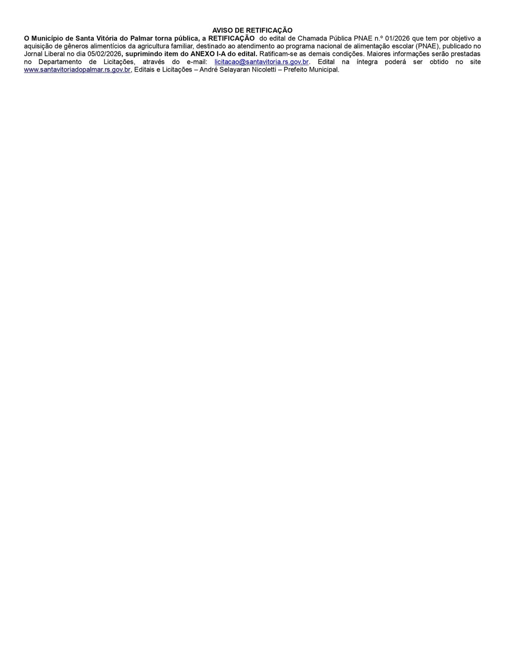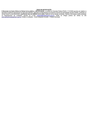 O Município de Santa Vitória do Palmar torna pública, a RETIFICAÇÃO do edital de Chamada Pública PNAE n.o 01/2026 que tem por objetivo a aquisição de gêneros alimentícios da agricultura familiar,