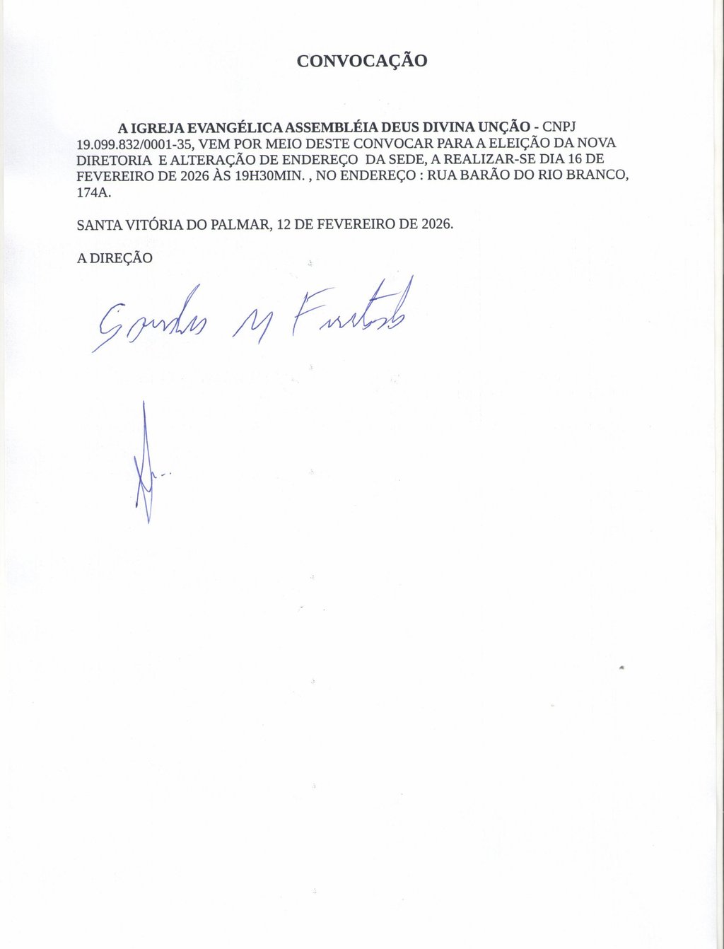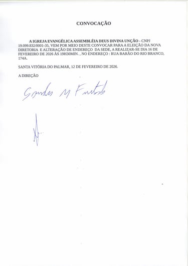 CONVOCAÇÃO -A IGREJA DA ASSEMBLÉIA DE DEUS DA DIVINA UNÇÃO DE SANTA VITÓRIA DO PALMAL-RS, CNPJ 19.099.832./0001-32