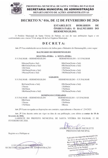 DECRETO N.º 016, DE 12 DE FEVEREIRO DE 2026