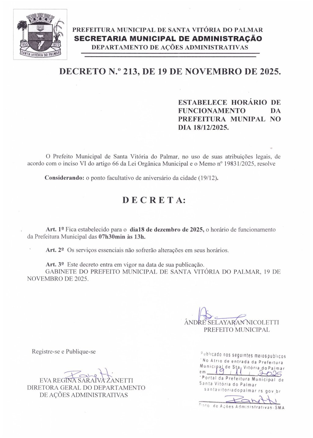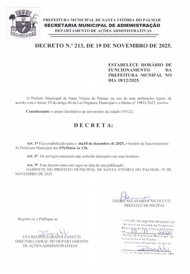 ESTABELECE HORÁRIO DE FUNCIONAMENTO DA PREFEITURA MUNIPAL NO DIA 18/12/2025. O Prefeito Municipal de Santa Vitória do Palmar, no uso de suas atribuições legais, de acordo com o inciso VI do artigo 66 da Lei Orgânica Municipal e o Memo nº 19831/2025, resolve - Considerando: o ponto facultativo de aniversário da cidade (19/12).