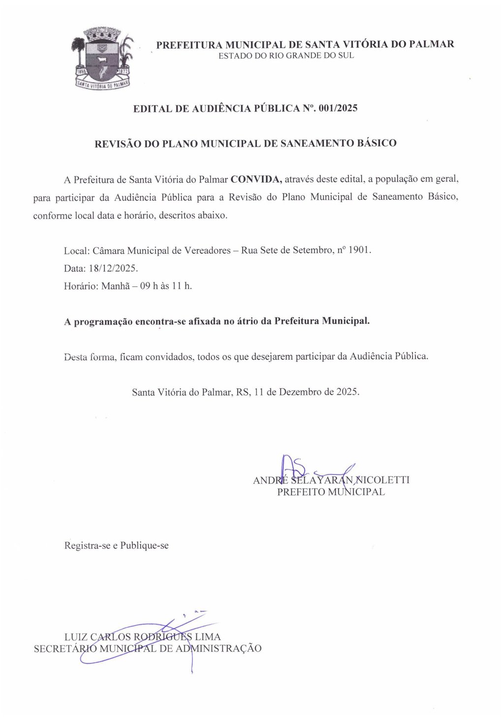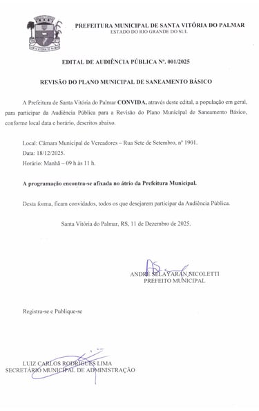 A Prefeitura de Santa Vitória do Palmar CONVIDA, através deste edital, a população em geral, para participar da Audiência Pública para a Revisão do Plano Municipal de Saneamento Básico, conforme local data e horário, descritos abaixo.
