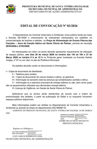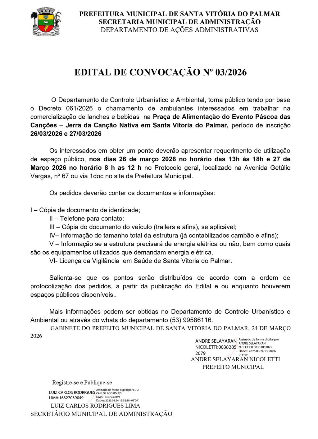 Chamamento de ambulantes interessados em trabalhar na comercialização de lanches e bebidas na Praça de Alimentação do Evento Páscoa das Canções – Jerra da Canção Nativa em Santa Vitoria do Palmar, período de inscrição 26/03/2026 e 27/03/2026