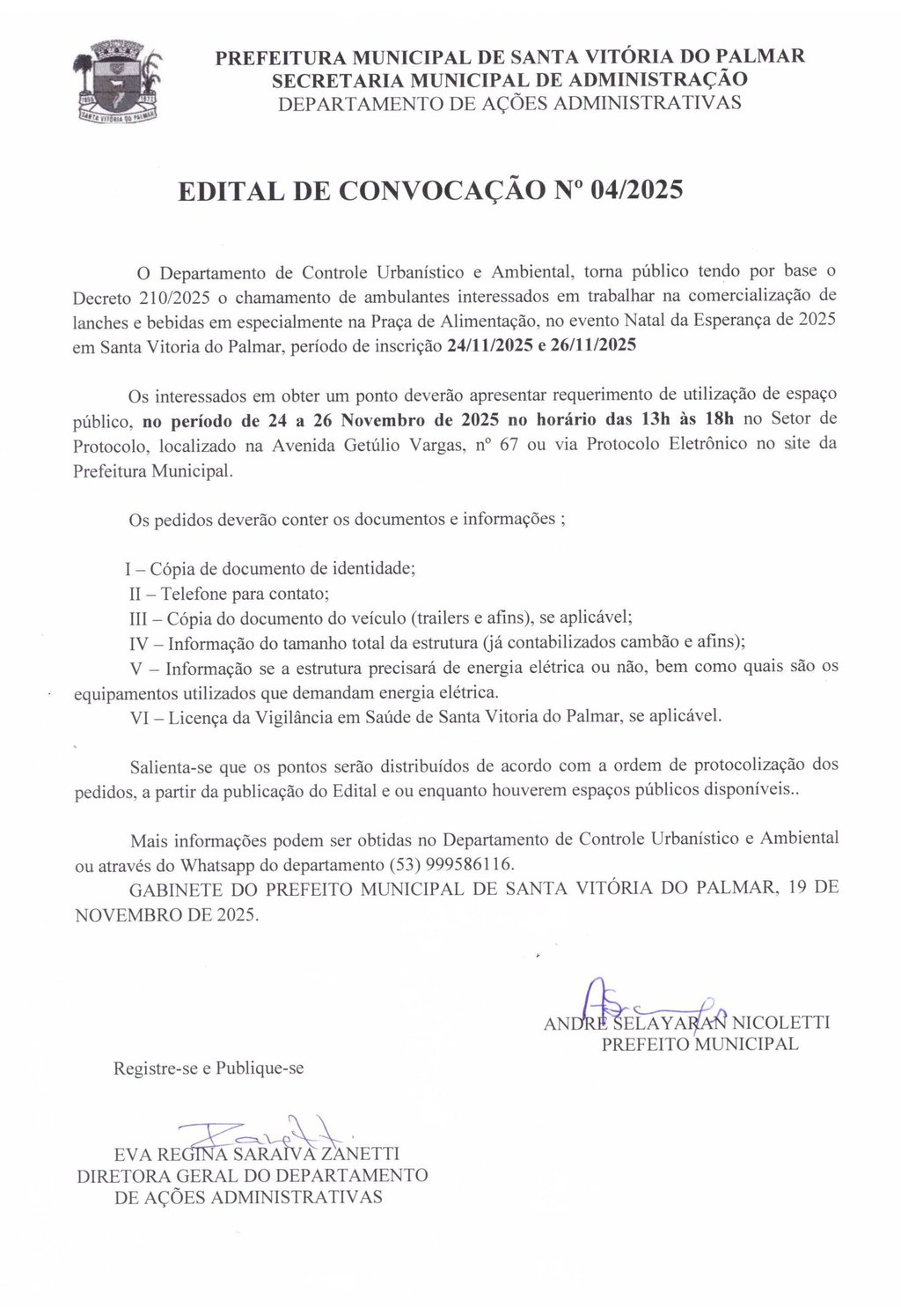 O Departamento de Controle Urbanístico e Ambiental, torna público tendo por base o Decreto 211/2025 o chamamento de ambulantes interessados em trabalhar na comercialização de roupas e artesanatos no Balneário da Barra do Chuí, em Santa Vitoria do Palmar, período de inscrição de 24/11/2025 a 26/11/2025. - Os interessados em obter um ponto deverão apresentar requerimento de utilização de espaço público, no período de 24 a 26 Novembro de 2025 no horário das 13h às 18h no Setor de Protocolo, localizado na Avenida Getúlio Vargas, nº 67 ou via Protocolo Eletrônico no site da Prefeitura Municipal.