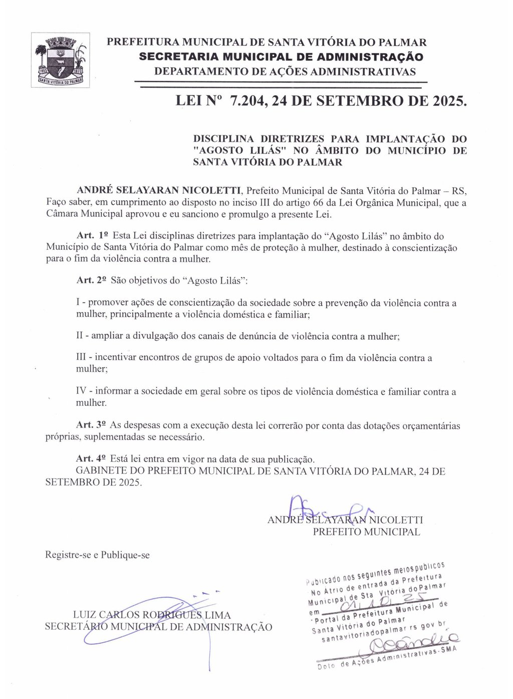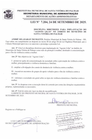 DISCIPLINA DIRETRIZES PARA IMPLANTAÇÃO DO "AGOSTO LILÁS" NO ÂMBITO DO MUNICÍPIO DE SANTA VITÓRIA DO PALMAR ANDRÉ SELAYARAN NICOLETTI, Prefeito Municipal de Santa Vitória do Palmar - RS, Faço saber, em cumprimento ao disposto no inciso III do artigo 66 da Lei Orgânica Municipal, que a Câmara Municipal aprovou e eu sanciono e promulgo a presente Lei.
