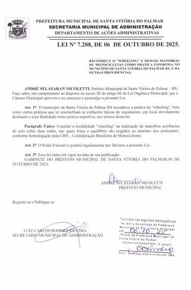 RECONHECE O "WHEELING" E DEMAIS MANOBRAS DE MOTOCICLETAS COMO PRATICA ESPORTIVA NO MUNICÍPIO DE SANTA VITORIA DO PALMAR RS, E DA OUTRAS PROVIDENCIAS. - ANDRÉ SELAYARAN NICOLETTI, Prefeito Municipal de Santa Vitória do Palmar - RS, Faço saber, em cumprimento ao disposto no inciso III do artigo 66 da Lei Orgânica Municipal, que a Câmara Municipal aprovou e eu sanciono e promulgo a presente Lei.