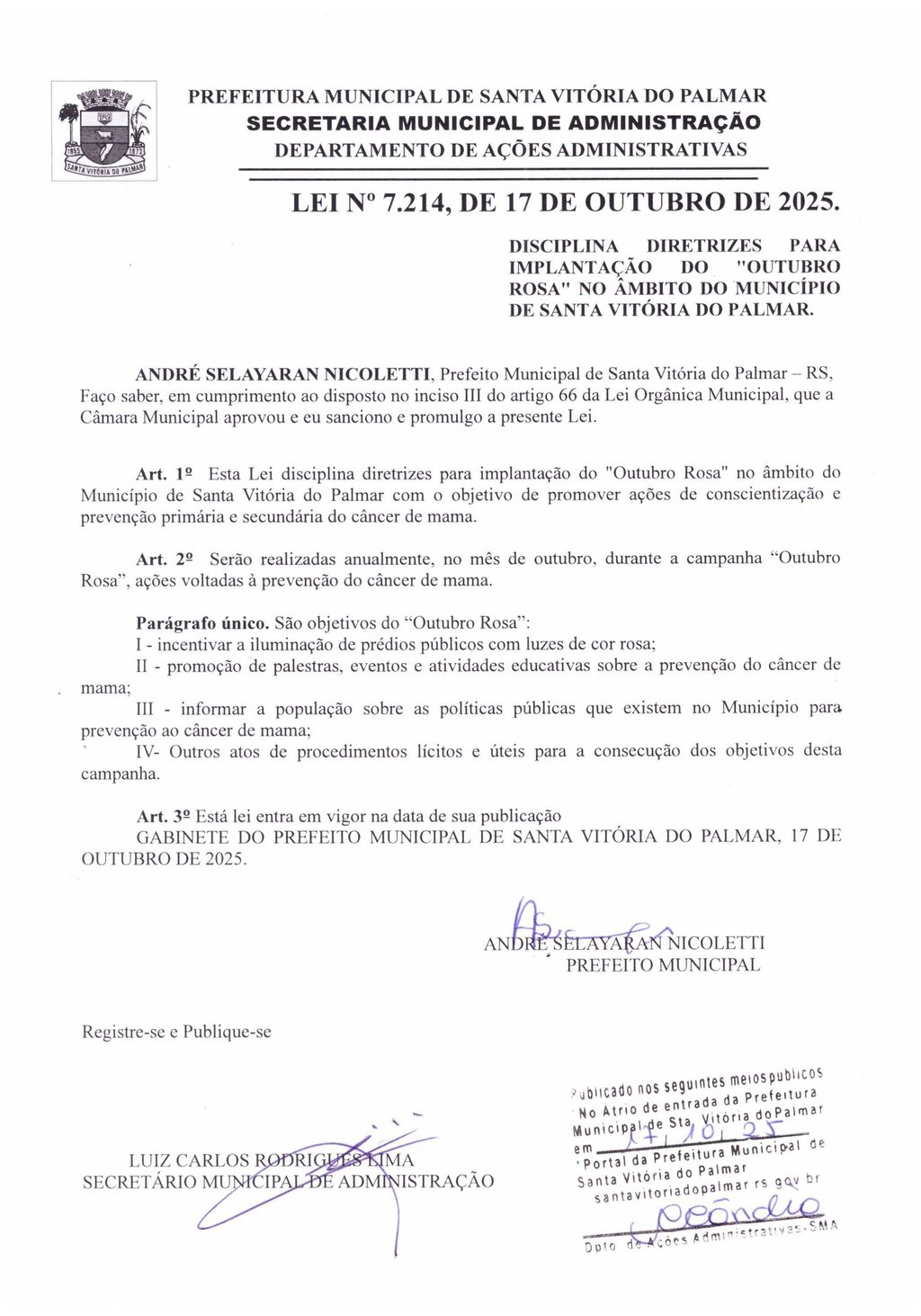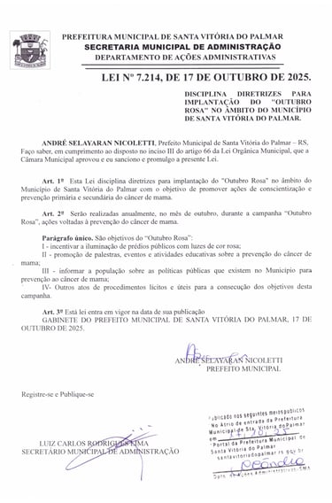 DISCIPLINA DIRETRIZES PARA IMPLANTAÇÃO DO OUTUBRO ROSA; NO ÂMBITO DO MUNICÍPIO DE SANTA VITÓRIA DO PALMAR. - ANDRÉ SELAYARAN NICOLETTI, Prefeito Municipal de Santa Vitória do Palmar – RS, Faço saber, em cumprimento ao disposto no inciso III do artigo 66 da Lei Orgânica Municipal,