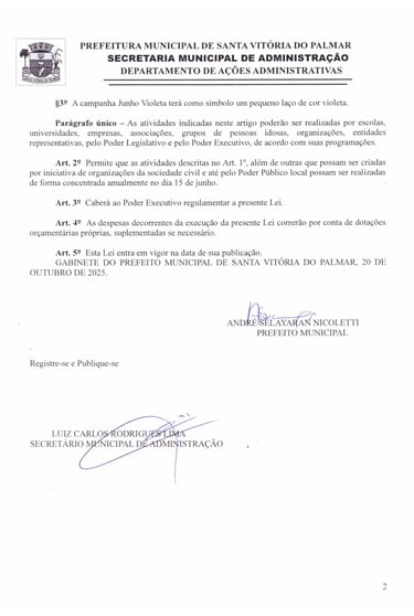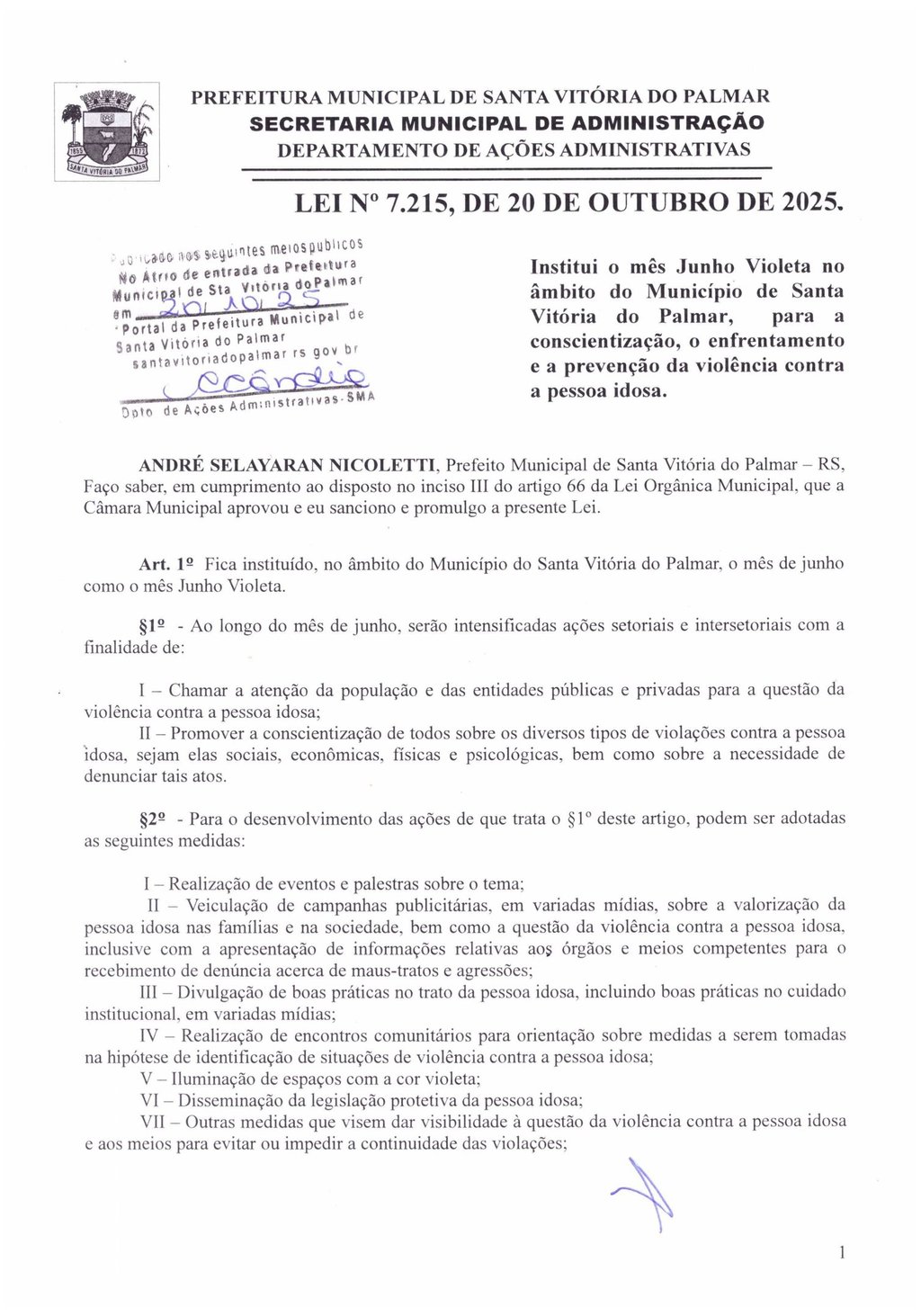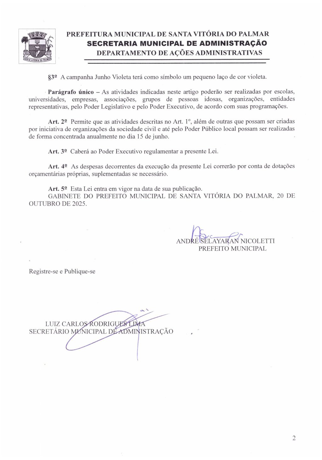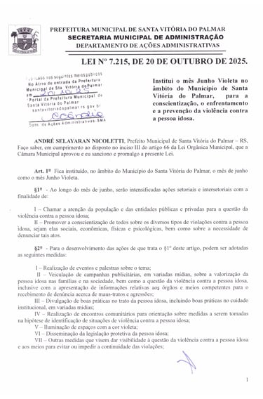 Institui o mês Junho Violeta no âmbito do Município de Santa Vitória do Palmar, para a conscientização, o enfrentamento e a prevenção da violência contra a pessoa idosa. - ANDRÉ SELAYARAN NICOLETTI, Prefeito Municipal de Santa Vitória do Palmar – RS, Faço saber, em cumprimento ao disposto no inciso III do artigo 66 da Lei Orgânica Municipal,