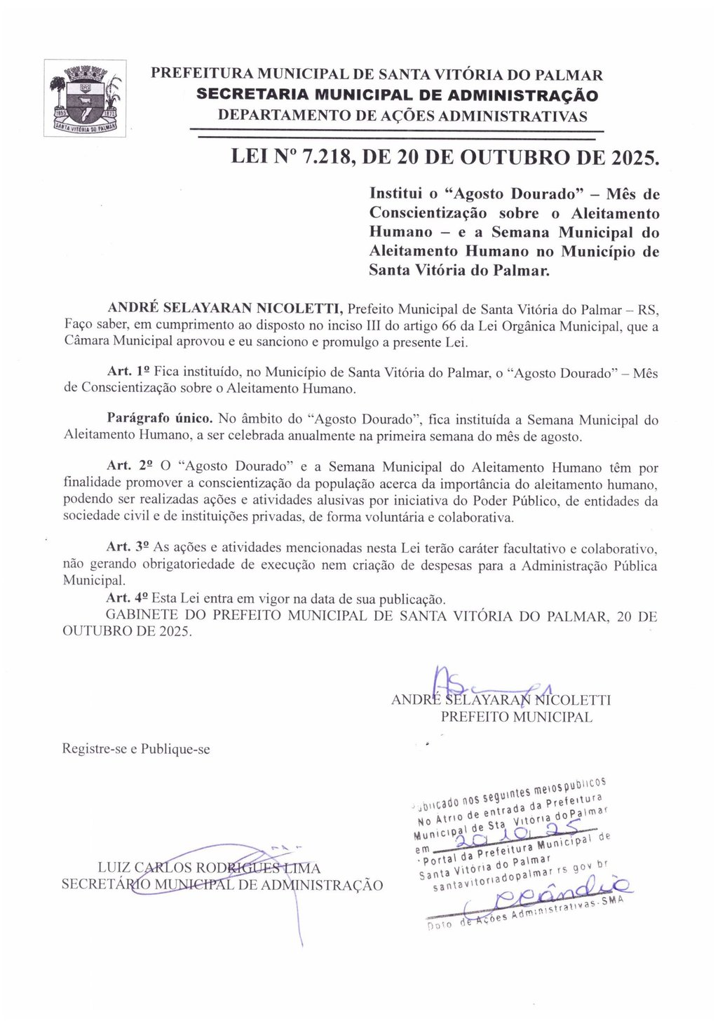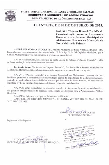 Institui o “Agosto Dourado” – Mês de Conscientização sobre o Aleitamento Humano – e a Semana Municipal do Aleitamento Humano no Município de Santa Vitória do Palmar. - ANDRÉ SELAYARAN NICOLETTI, Prefeito Municipal de Santa Vitória do Palmar – RS, Faço saber, em cumprimento ao disposto no inciso III do artigo 66 da Lei Orgânica Municipal,