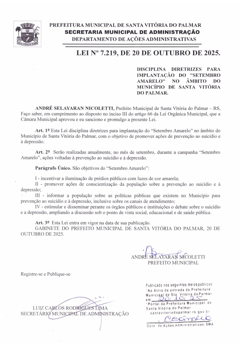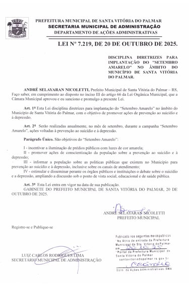 DISCIPLINA DIRETRIZES PARA IMPLANTAÇÃO DO SETEMBRO AMARELO NO ÂMBITO DO MUNICÍPIO DE SANTA VITÓRIA DO PALMAR. - ANDRÉ SELAYARAN NICOLETTI, Prefeito Municipal de Santa Vitória do Palmar – RS, Faço saber, em cumprimento ao disposto no inciso III do artigo 66 da Lei Orgânica Municipal,