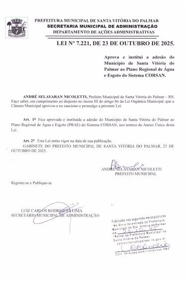 Aprova e institui a adesão do Município de Santa Vitória do Palmar ao Plano Regional de Água e Esgoto do Sistema CORSAN. - ANDRÉ SELAYARAN NICOLETTI, Prefeito Municipal de Santa Vitória do Palmar – RS, Faço saber, em cumprimento ao disposto no inciso III do artigo 66 da Lei Orgânica Municipal