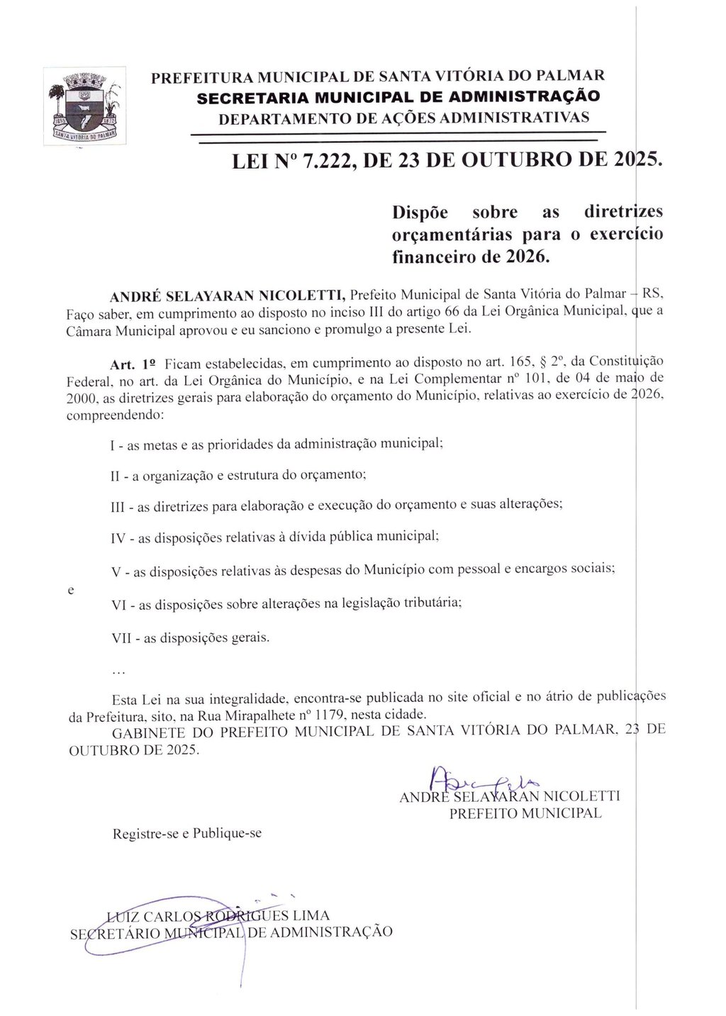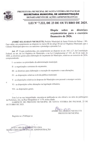 Dispõe sobre as diretrizes orçamentárias para o exercício financeiro de 2026. - ANDRÉ SELAYARAN NICOLETTI, Prefeito Municipal de Santa Vitória do Palmar – RS, Faço saber, em cumprimento ao disposto no inciso III do artigo 66 da Lei Orgânica Municipal