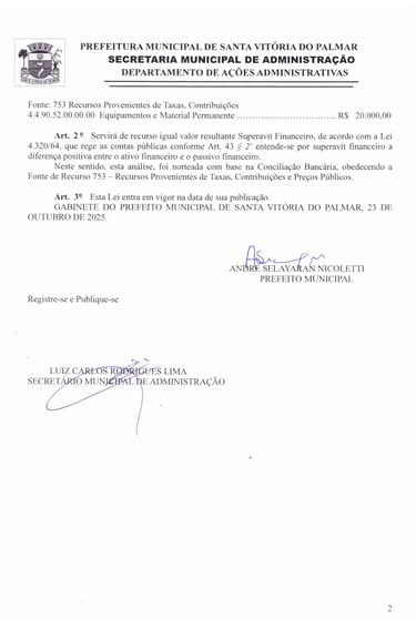 Autoriza abertura de Crédito Suplementar no valor de R$ 90.067,49 (noventa mil, sessenta e sete reais e quarenta e nove centavos). - ANDRÉ SELAYARAN NICOLETTI, Prefeito Municipal de Santa Vitória do Palmar – RS, Faço saber, em cumprimento ao disposto no inciso III do artigo 66 da Lei Orgânica Municipal,