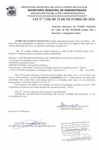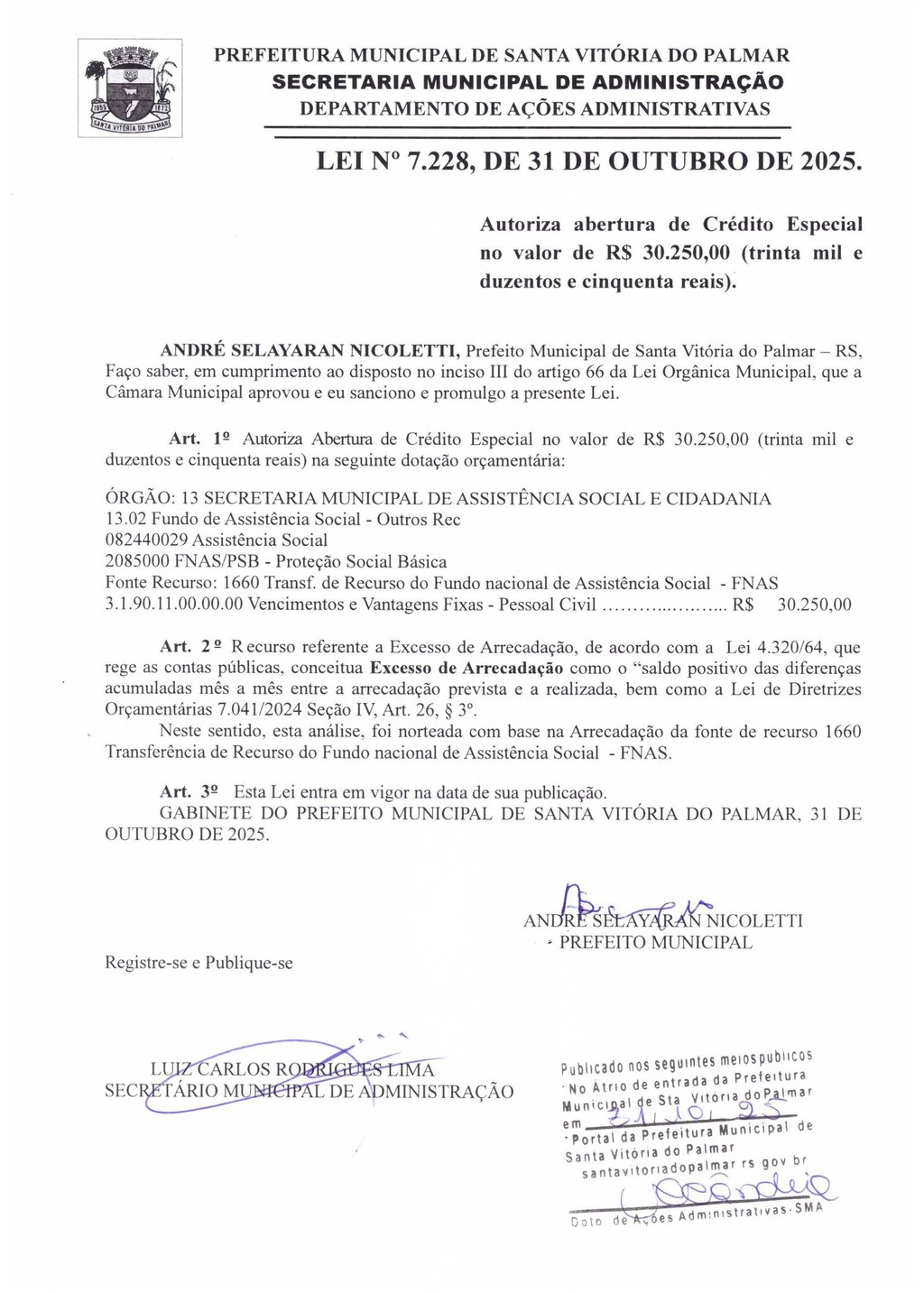LEI Nº 7.228, DE 31 DE OUTUBRO DE 2025.