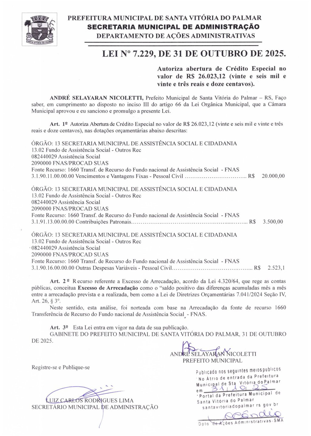 LEI Nº 7.229, DE 31 DE OUTUBRO DE 2025.