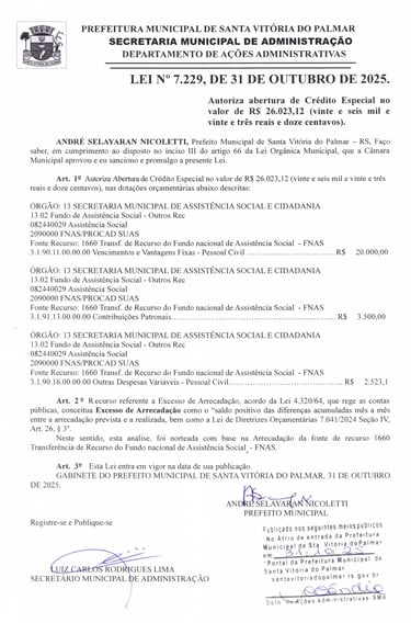 Autoriza abertura de Crédito Especial no valor de R$ 26.023,12 (vinte e seis mil e vinte e três reais e doze centavos). - ANDRÉ SELAYARAN NICOLETTI, Prefeito Municipal de Santa Vitória do Palmar – RS, Faço saber, em cumprimento ao disposto no inciso III do artigo 66 da Lei Orgânica Municipal