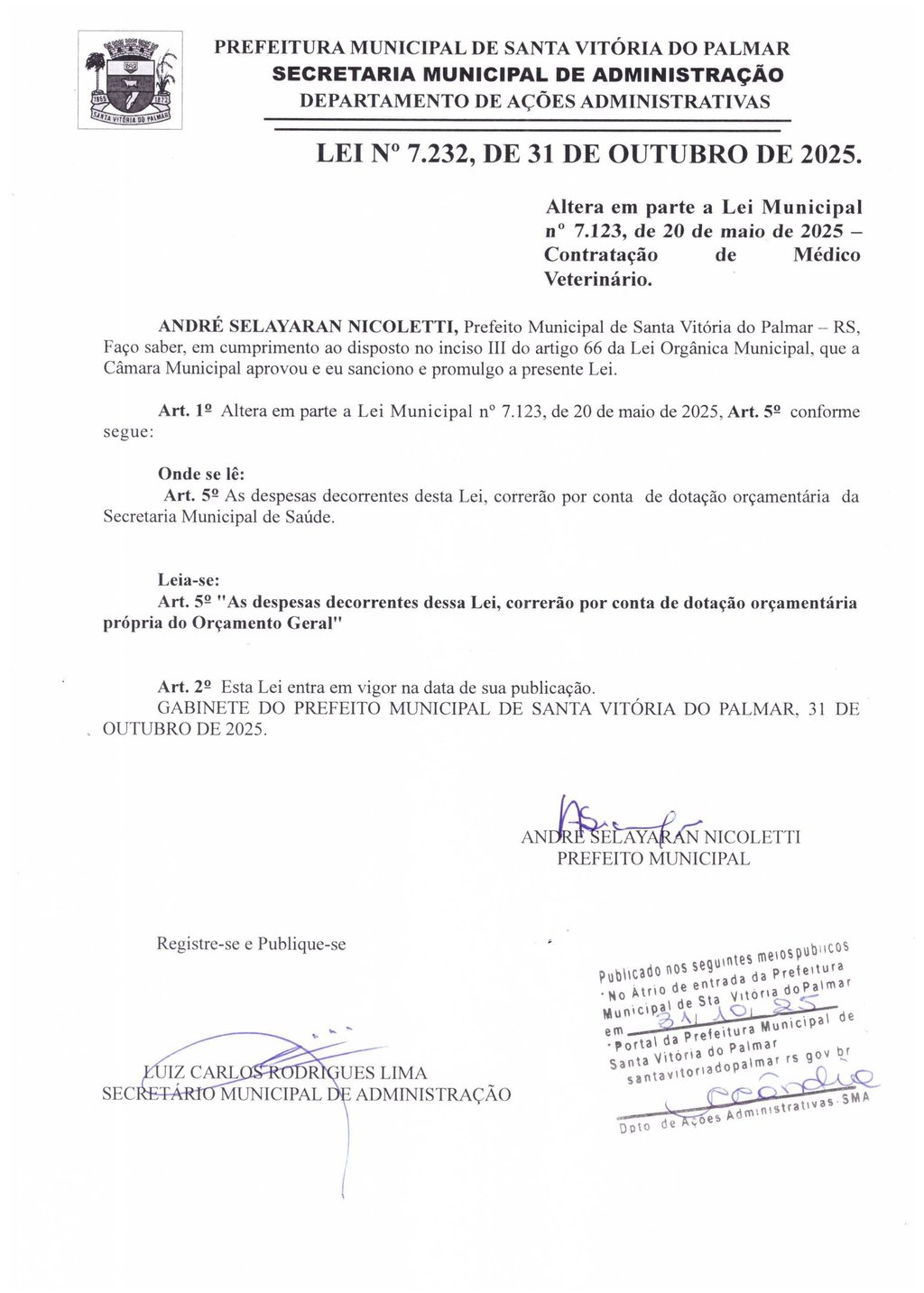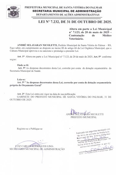 Altera em parte a Lei Municipal nº 7.123, de 20 de maio de 2025 – Contratação de Médico Veterinário. - ANDRÉ SELAYARAN NICOLETTI, Prefeito Municipal de Santa Vitória do Palmar – RS, Faço saber, em cumprimento ao disposto no inciso III do artigo 66 da Lei Orgânica Municipal