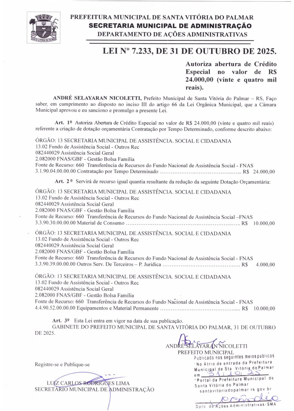 Autoriza abertura de Crédito Especial no valor de R$ 24.000,00 (vinte e quatro mil reais). - ANDRÉ SELAYARAN NICOLETTI, Prefeito Municipal de Santa Vitória do Palmar – RS, Faço saber, em cumprimento ao disposto no inciso III do artigo 66 da Lei Orgânica Municipal