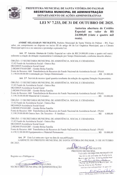 LEI Nº 7.233, DE 31 DE OUTUBRO DE 2025.