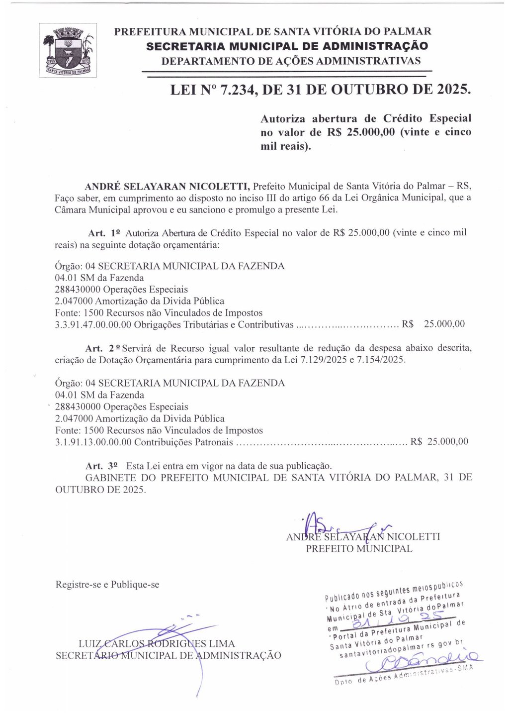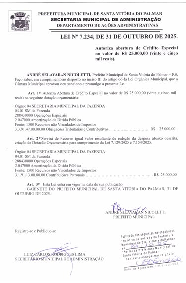 Autoriza abertura de Crédito Especial no valor de R$ 25.000,00 (vinte e cinco mil reais). - ANDRÉ SELAYARAN NICOLETTI, Prefeito Municipal de Santa Vitória do Palmar – RS, Faço saber, em cumprimento ao disposto no inciso III do artigo 66 da Lei Orgânica Municipal