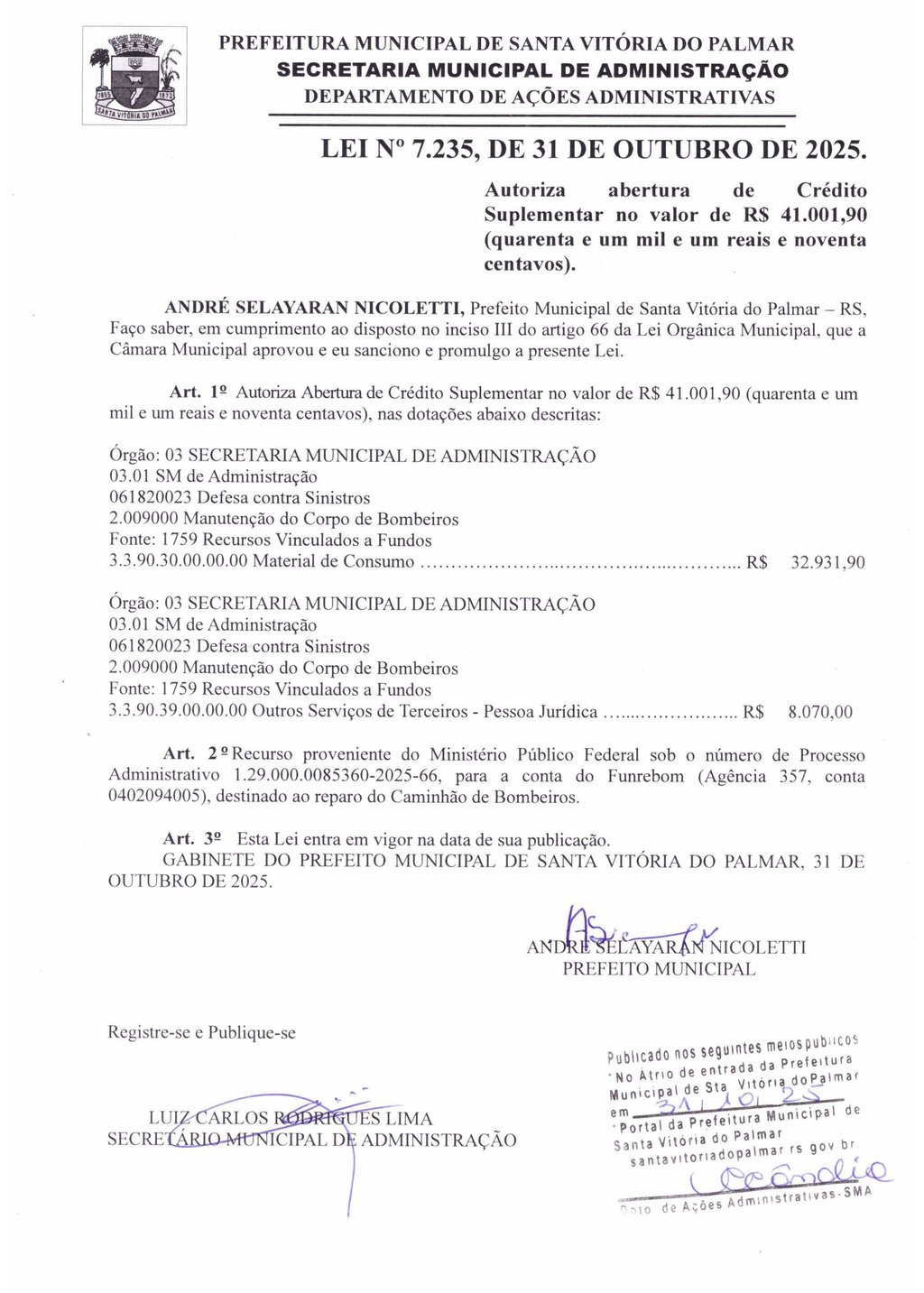 LEI Nº 7.235, DE 31 DE OUTUBRO DE 2025.