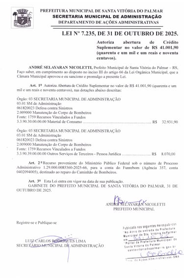 Autoriza abertura de Crédito Suplementar no valor de R$ 41.001,90 (quarenta e um mil e um reais e noventa centavos). - ANDRÉ SELAYARAN NICOLETTI, Prefeito Municipal de Santa Vitória do Palmar – RS, Faço saber, em cumprimento ao disposto no inciso III do artigo 66 da Lei Orgânica Municipal