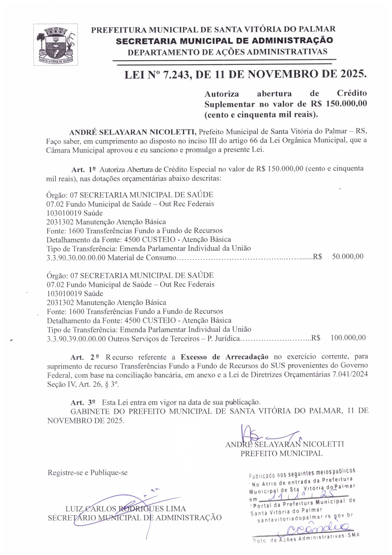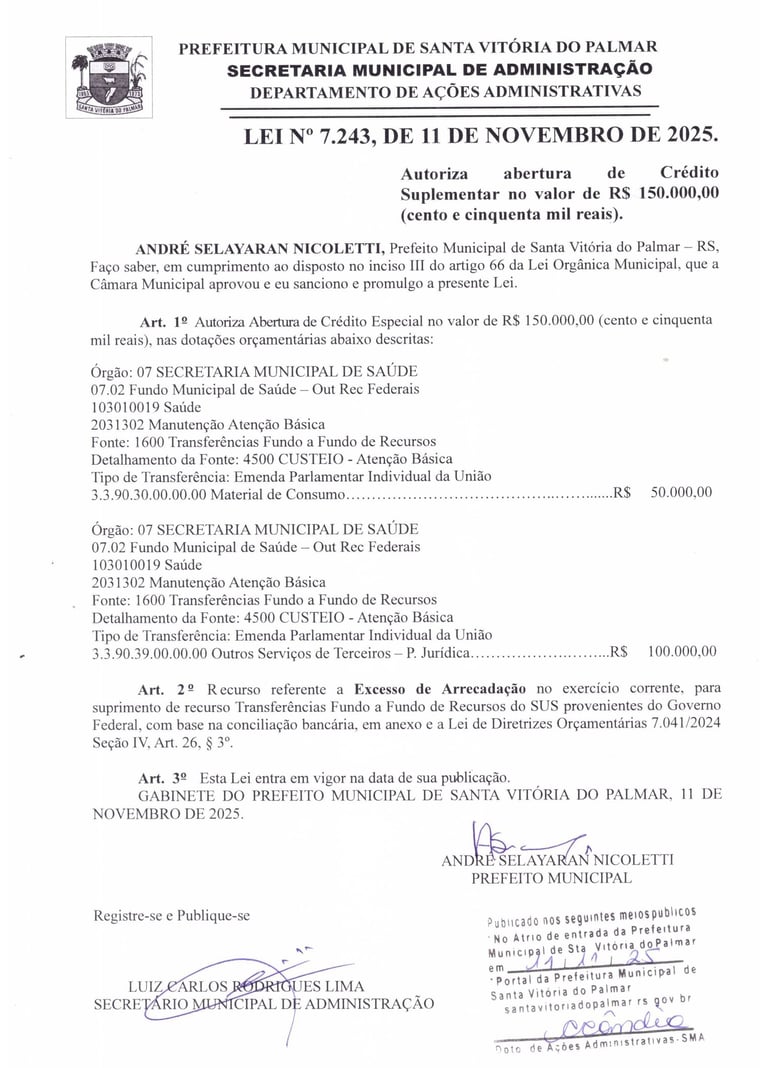 LEI Nº 7.243, DE 11 DE NOVEMBRO DE 2025.