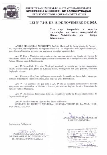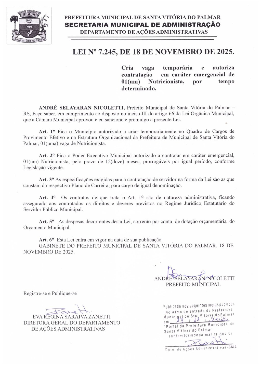 LEI Nº 7.245, DE 18 DE NOVEMBRO DE 2025.