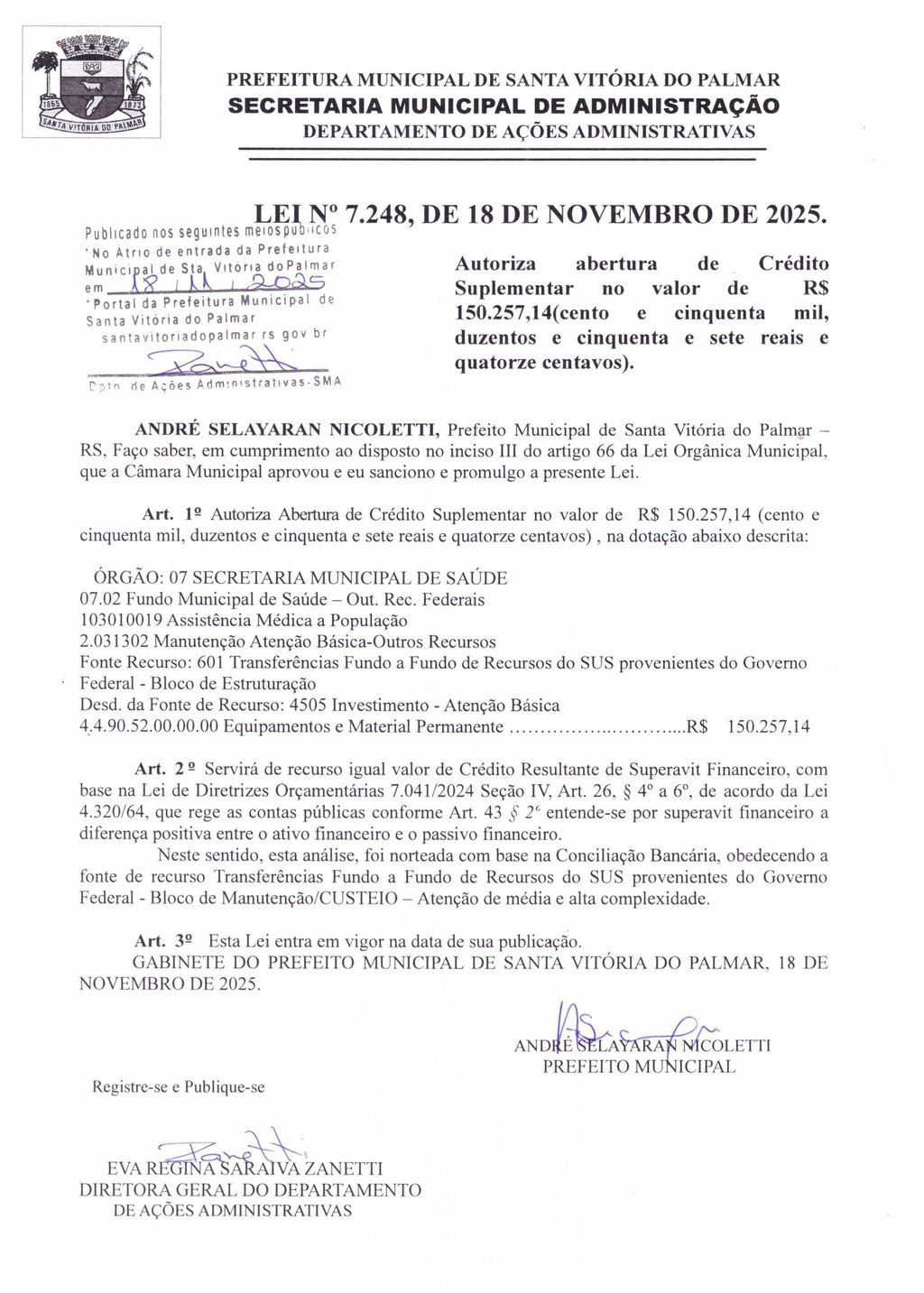 LEI Nº 7.248, DE 18 DE NOVEMBRO DE 2025.
