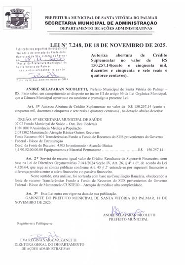 Autoriza abertura de Crédito Suplementar no valor de R$ 150.257,14(cento e cinquenta mil, duzentos e cinquenta e sete reais e quatorze centavos). ANDRÉ SELAYARAN NICOLETTI, Prefeito Municipal de Santa Vitória do Palmar – RS, Faço saber, em cumprimento ao disposto no inciso III do artigo 66 da Lei Orgânica Municipal