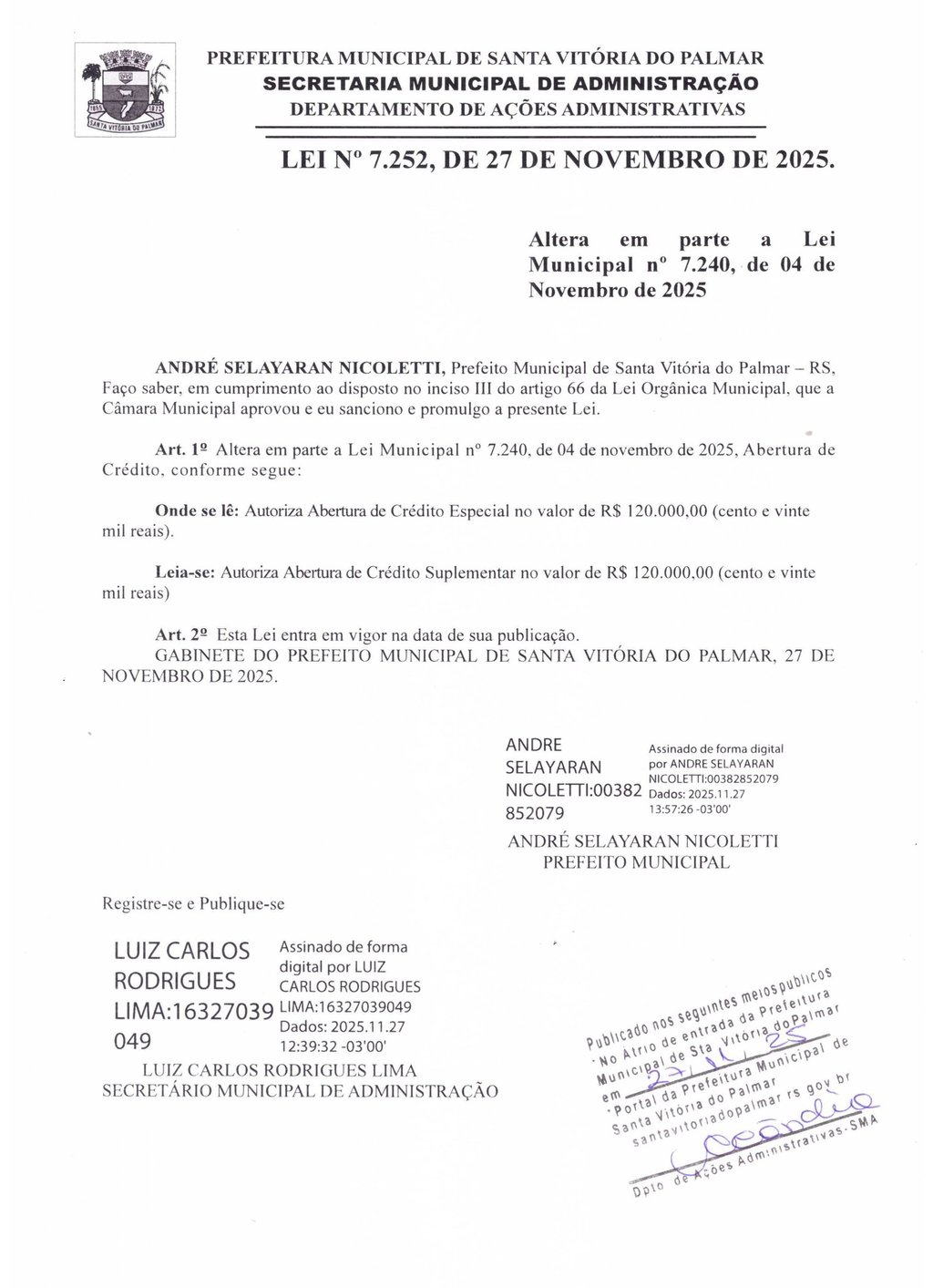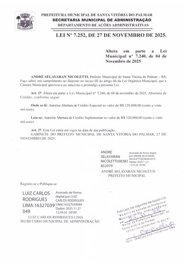 Altera em parte a Lei Municipal nº 7.240, de 04 de Novembro de 2025 ANDRÉ SELAYARAN NICOLETTI, Prefeito Municipal de Santa Vitória do Palmar – RS, Faço saber, em cumprimento ao disposto no inciso III do artigo 66 da Lei Orgânica Municipal,