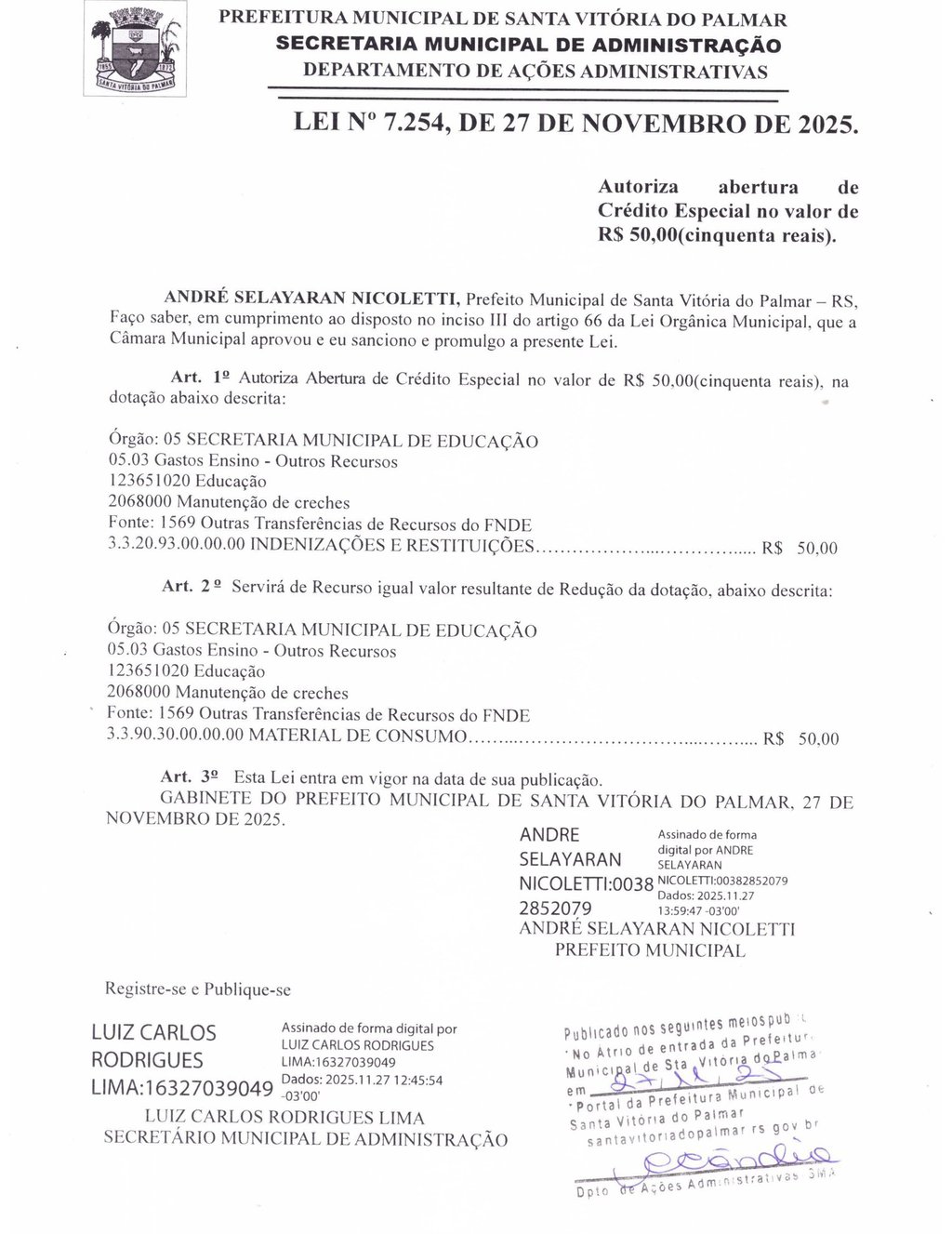 Autoriza abertura de Crédito Especial no valor de R$ 50,00(cinquenta reais). ANDRÉ SELAYARAN NICOLETTI, Prefeito Municipal de Santa Vitória do Palmar – RS, Faço saber, em cumprimento ao disposto no inciso III do artigo 66 da Lei Orgânica Municipal,