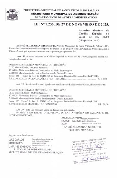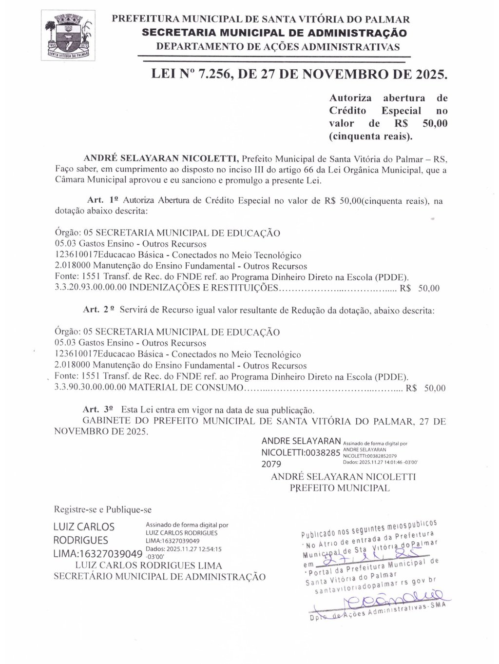 LEI Nº 7.256, DE 27 DE NOVEMBRO DE 2025.