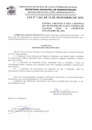 ESTIMA A RECEITA E FIXA A DESPESA DO MUNICÍPIO DE SANTA VITÓRIA DO PALMAR PARA O EXERCÍCIO FINANCEIRO DE 2026.