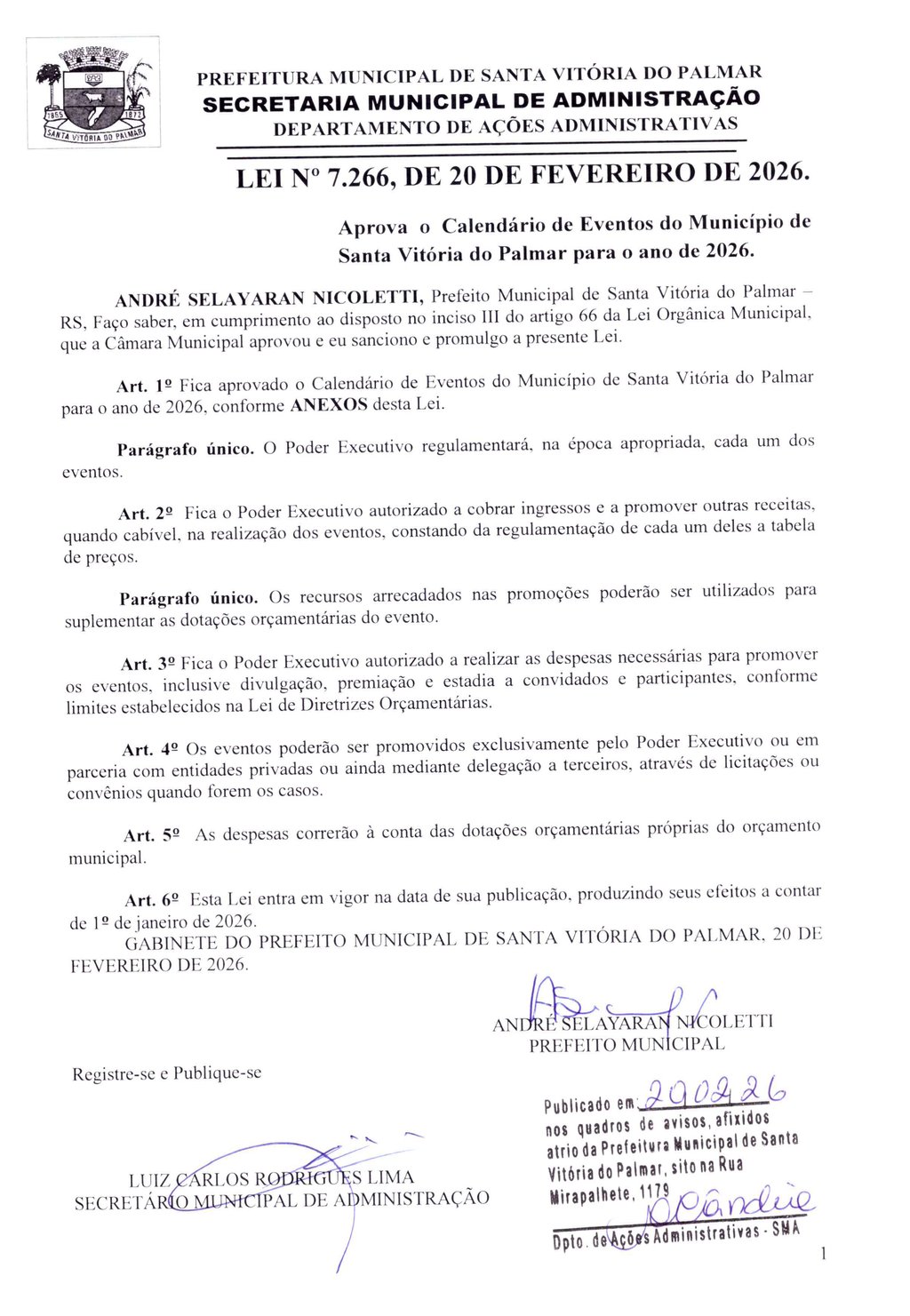 LEI Nº 7.266, DE 20 DE FEVEREIRO DE 2026.