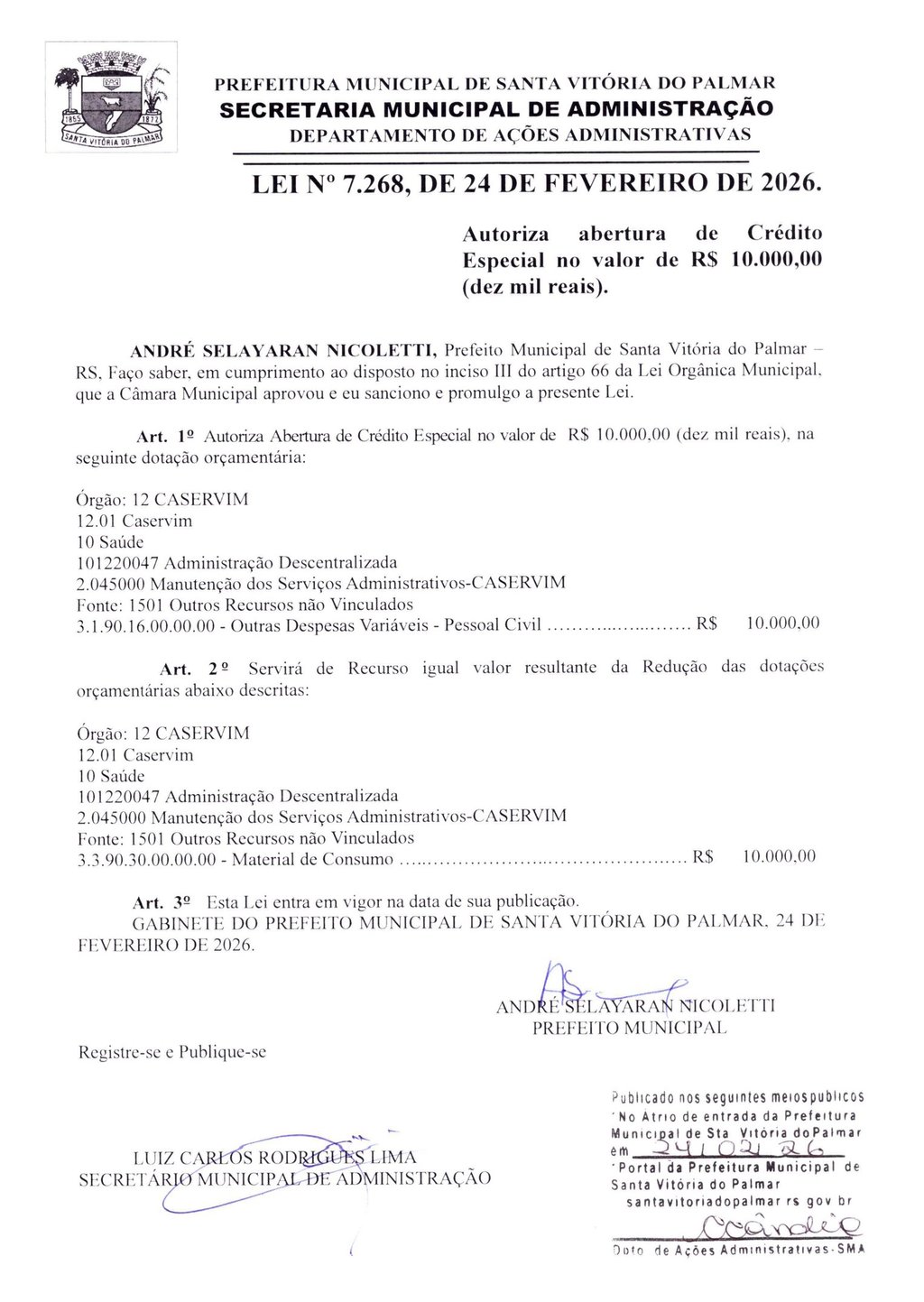 LEI Nº 7.268, DE 24 DE FEVEREIRO DE 2026.