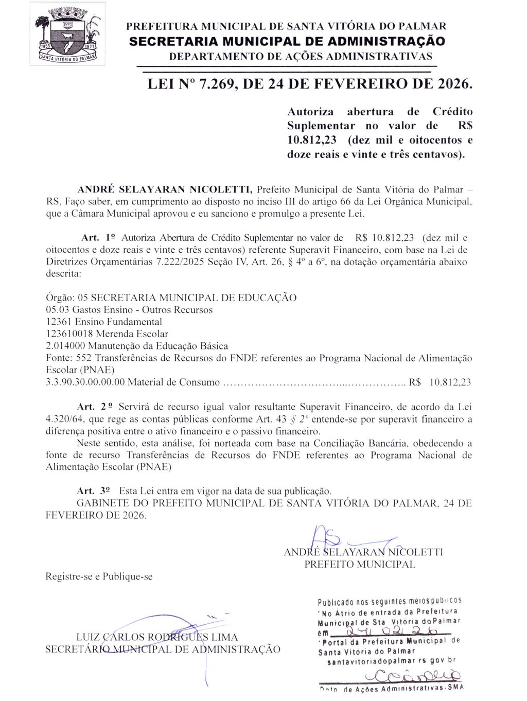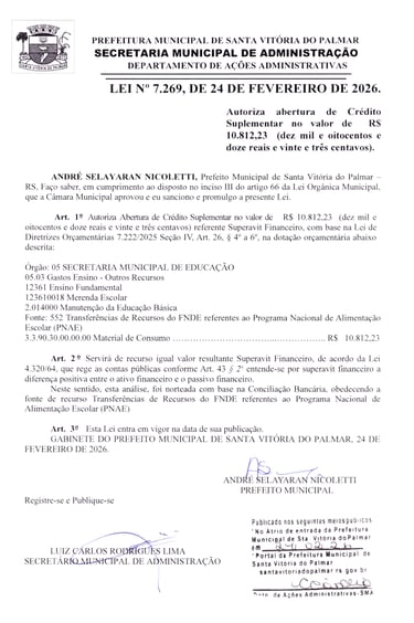 LEI Nº 7.269, DE 24 DE FEVEREIRO DE 2026.