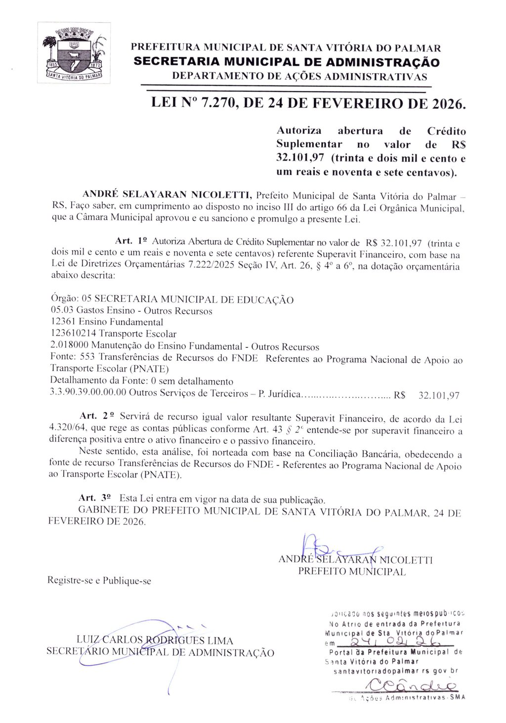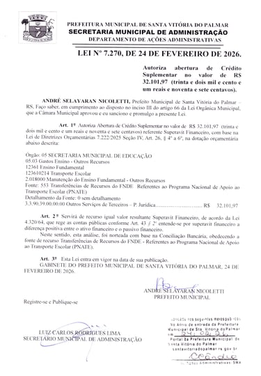LEI Nº 7.270, DE 24 DE FEVEREIRO DE 2026.