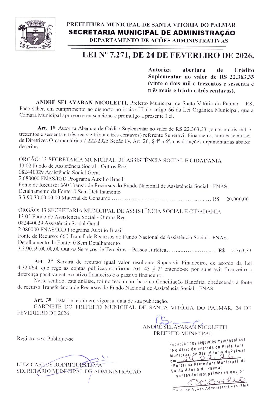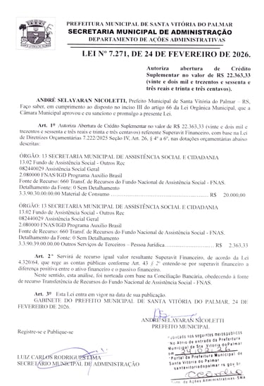 LEI Nº 7.271, DE 24 DE FEVEREIRO DE 2026.