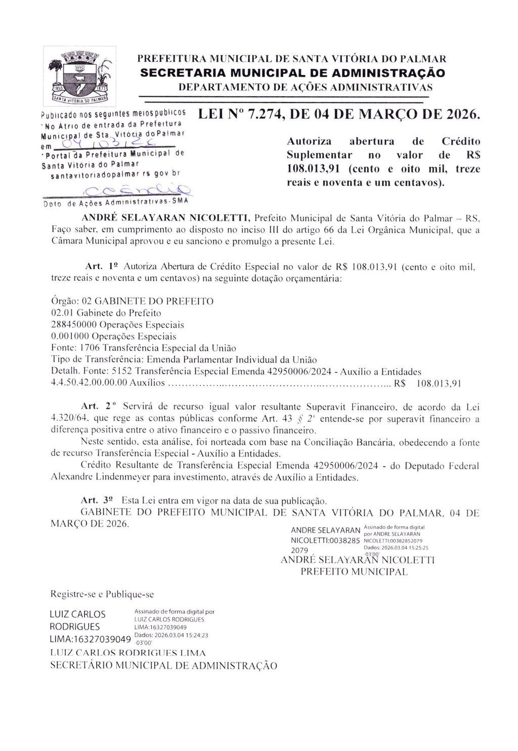 LEI Nº 7.274, DE 04 DE MARÇO DE 2026.