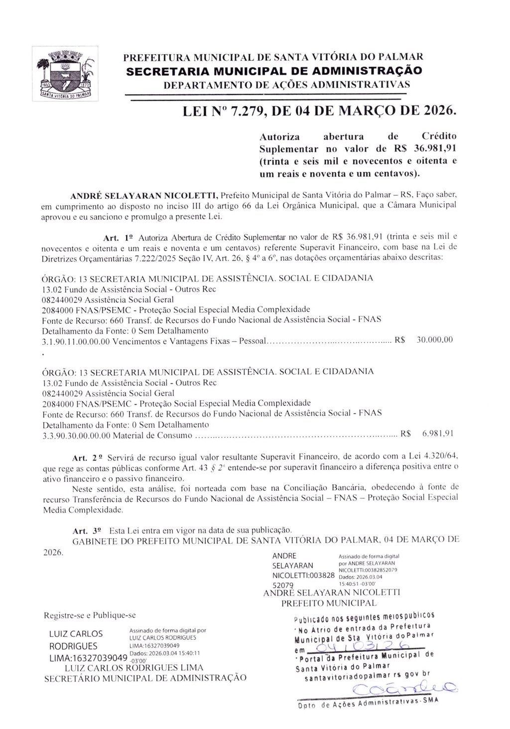 LEI Nº 7.279, DE 04 DE MARÇO DE 2026.