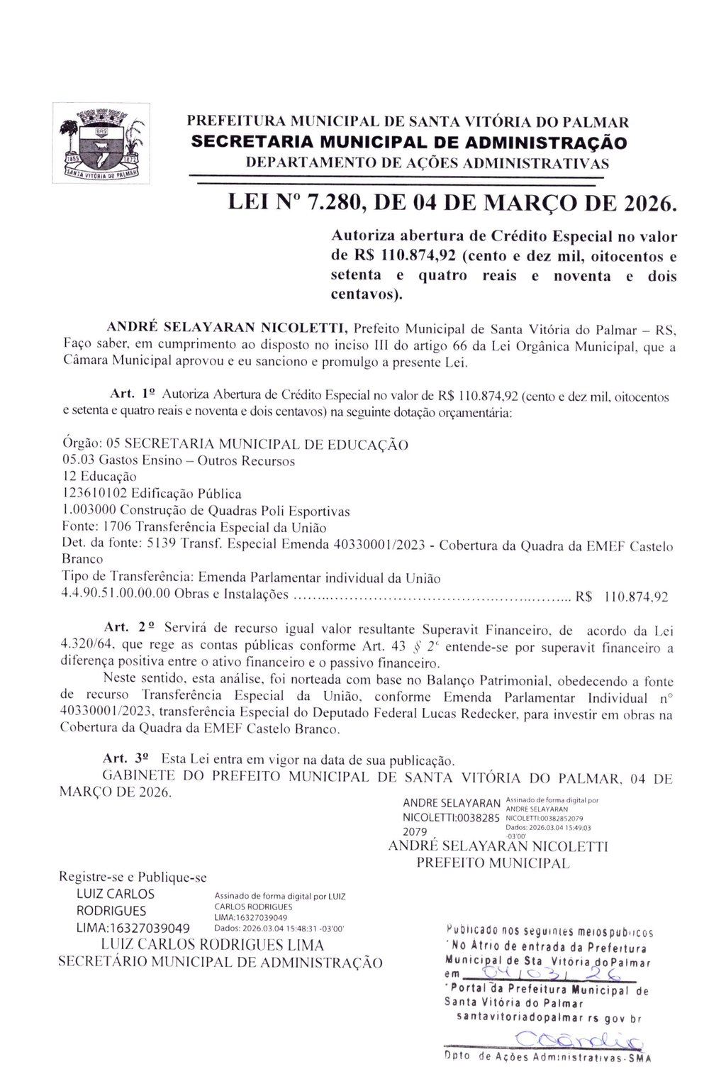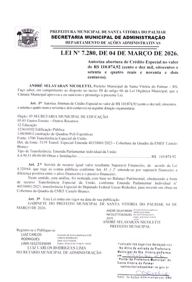 LEI Nº 7.280, DE 04 DE MARÇO DE 2026.