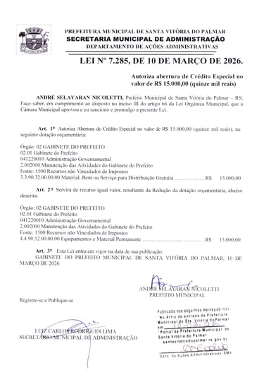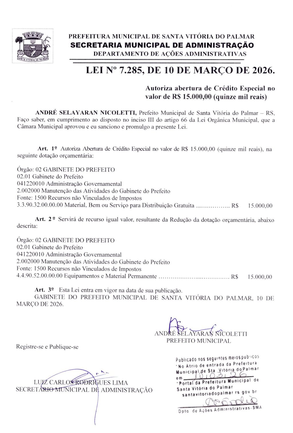 LEI Nº 7.285, DE 10 DE MARÇO DE 2026.