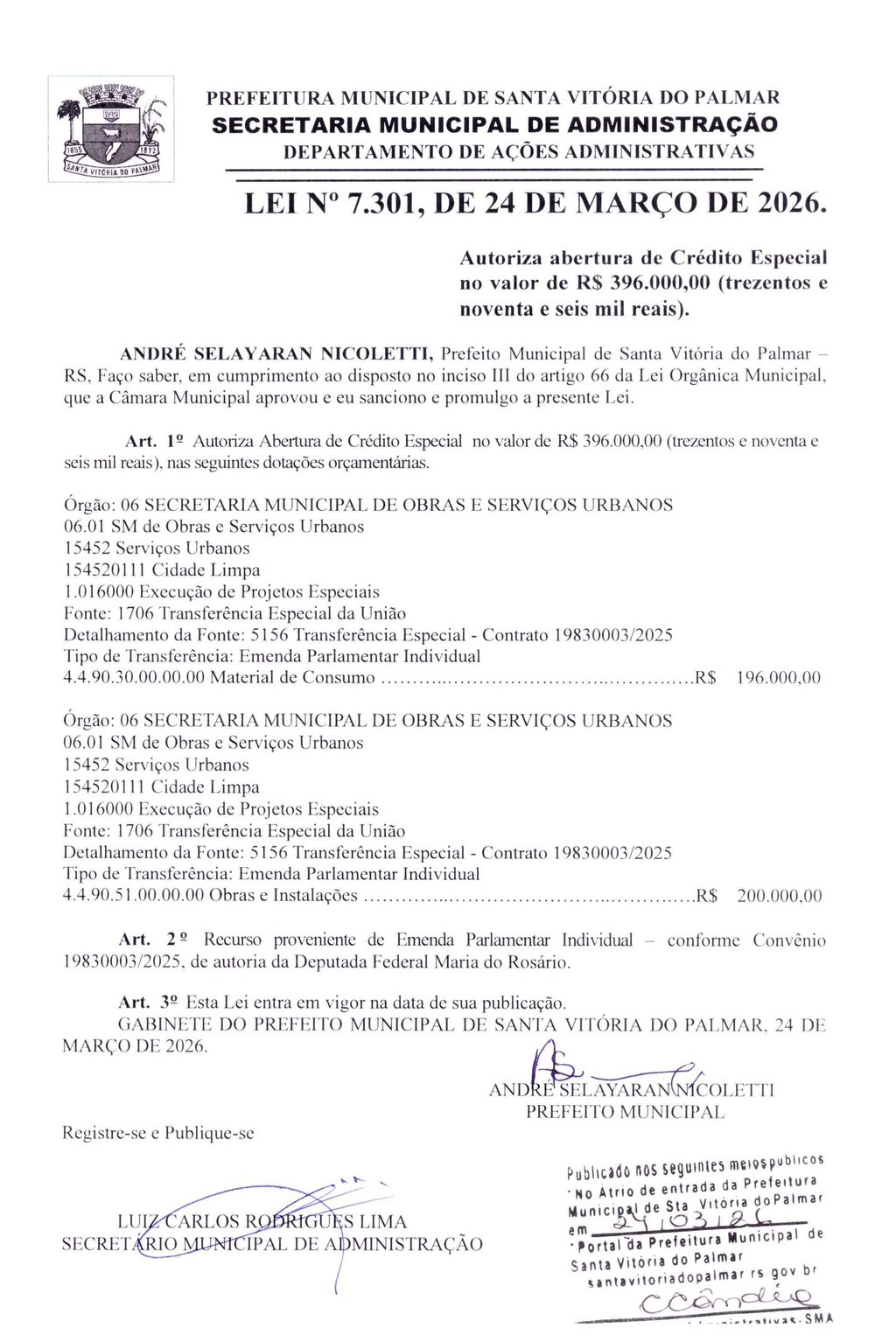 LEI Nº 7.301, DE 24 DE MARÇO DE 2026.