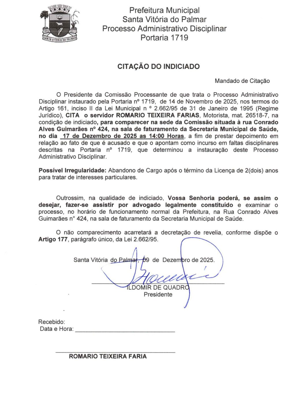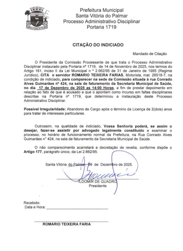 CITAÇÃO DO INDICIADO- O Presidente da Comissão Processante de que trata o Processo Administrativo Disciplinar instaurado pela Portaria no 1719, de 14 de Novembro de 2025, nos termos do Artigo 161, inciso II da Lei Municipal n° 2.662/95 de 31 de Janeiro de 1995 (Regime Jurídico), CITA o servidor ROMARIO TEIXEIRA FARIAS,