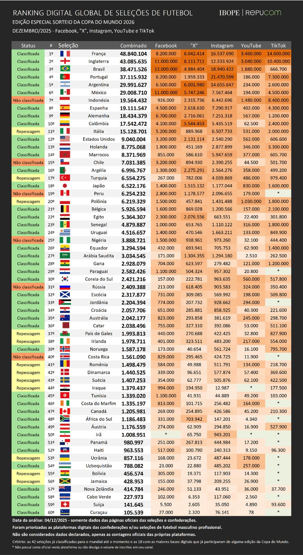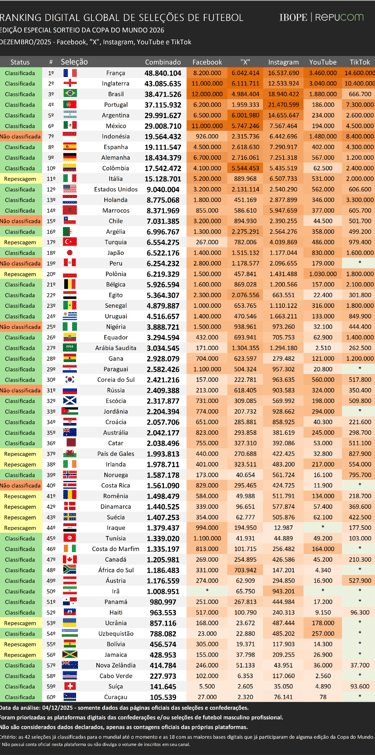 São Paulo, 05 de dezembro de 2025 – Nesta sexta-feira (5) acontece o sorteio dos grupos da Copa do Mundo FIFA de 2026, e o IBOPE Repucom divulga a nova edição do Ranking Digital das Seleções de Futebol no Mundo.